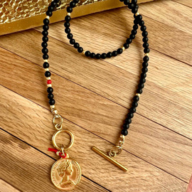 Olśniewający długi naszyjnik z czarnych kryształków i hematytów z monetą oraz perłą
