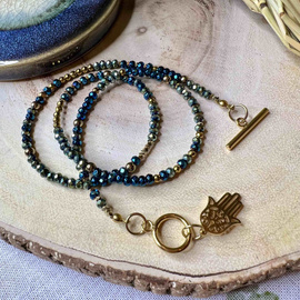 Naszyjnik z pereł i tanzanit, zawieszka Hamsa